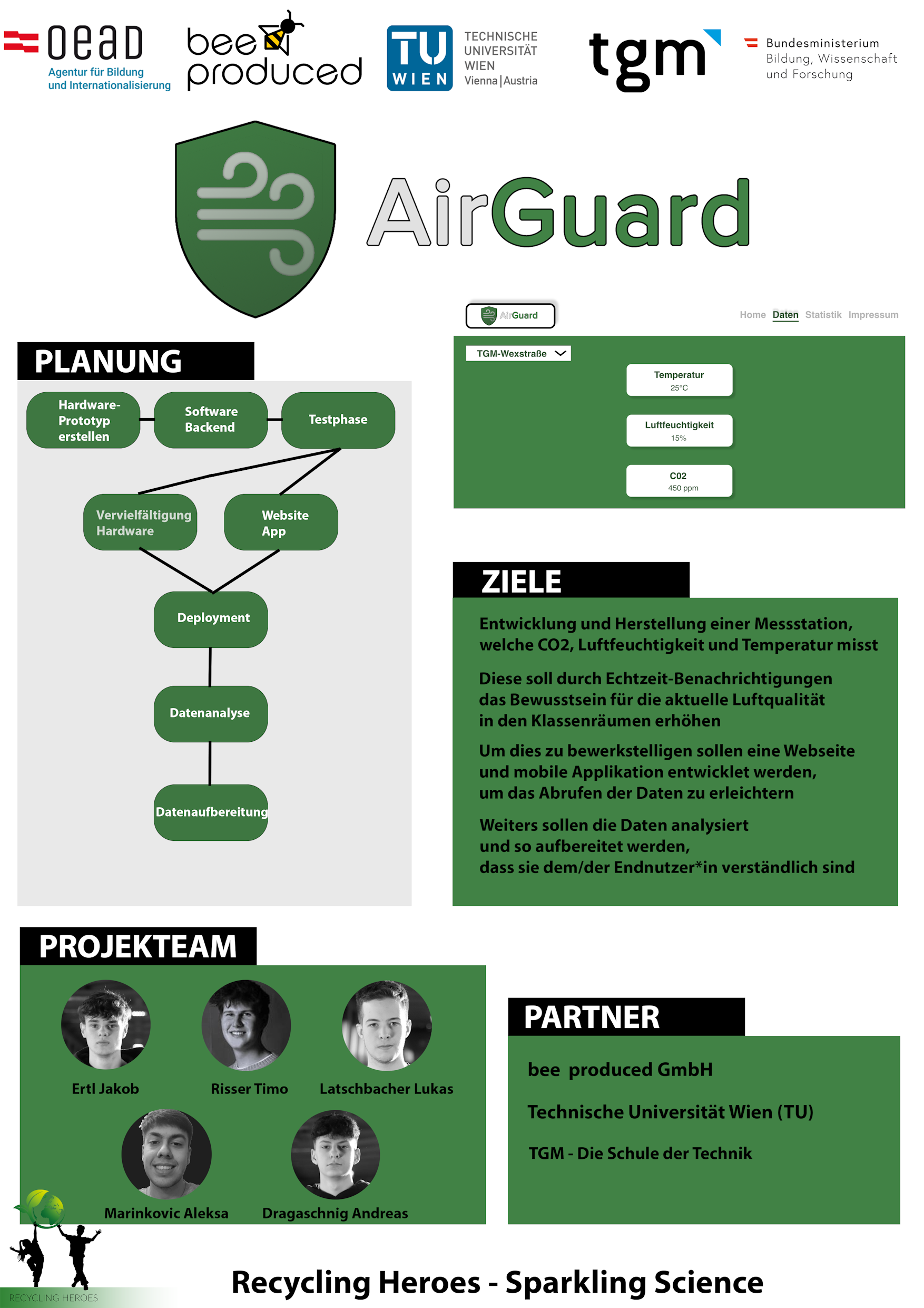 Mit AirGuard wollen wir die Vision von einer gesunden Lernumgebung in Schulen realisieren. Inmitten gesteigerter Sensibilität für Gesundheitsfragen bedingt durch vorherige Pandemien, entwickeln wir eine Messtation zur Beurteilung der Luftqualität in Innenräumen. Das Projekt wird durch die Entwicklung eines umfassenden Hardware- und Softwarepakets realisiert. Die Hardware besteht aus einem Mikrocontroller, einem Display und einem Sensor. Das umfassende Softwarepaket besteht aus einer Datenbank, einer intuitiven Website und mobilen App und einem Machine Learning Algorithmus. Die Datenbank stellt die zentrale Komponente der Softwarearchitektur dar. Sie speichert nicht nur, sondern gibt die Daten auch in Echtzeit über eine gesicherte Schnittstelle frei. Diese wird von der Website und der mobilen App verwendet. Mittels dieser können die User:innen die Daten bequem auf ihrem Laptop oder Handy abrufen. Weiters bietet die Website eine Statistik Unterseite auf welcher historische Daten graphisch angezeigt werden. Das Herzstück der Statistik-Seite ist jedoch die Anzeige unseres Algorithmus. Dieser ermöglicht es durch die Vorhersage von bis zu 60 Datenpunkte á eine Minute in die Zukunft, und erlaubt es daher proaktiv zu handeln, um die Luftqualität stets in einem optimalen Bereich zu halten. In Phase 1, der Testphase, stellen wir 5 Messtationen in verschiedene Klassenräume des TGM Wiens auf. In der Phase 2, der Deploymentphase, werden die Messtationen vervielfältigt und die Luftqualität an vier verschiedenen österreichischen Schulen überwachen.
