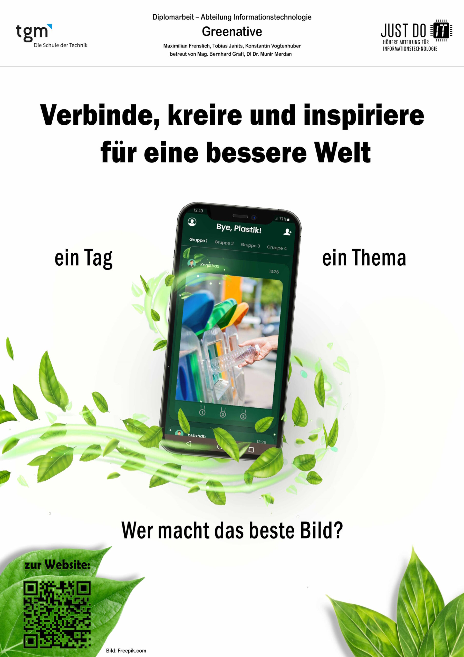 Verfolgt das Ziel Umweltschutz der Jugend näher zu bringen. Unser Team will mithilfe einer neuartigen Social Media Plattform mehr Interesse bei der jüngeren Generation wecken ohne dabei in die, vom Umweltthema leider gewohnte, Langeweile zu verfallen. Aus einem Themenpool wird jeden Tag ein neues Thema (natürlich Umweltschutz-orientiert) gezogen und angezeigt. Freunde unterteilen sich in Wettbewerbsgruppen um kreative Bilder, passend zur Tagesaufgabe zu posten. Dadurch lernen sie über umweltspezifische Themen und setzen sich verstärkt mit ihnen auseinander. Nachdem ein Bild gepostet wurde kann jedes Mitglied abstimmen, welche 3 Bilder ihm am besten gefallen. Am Ende des Tages wird der Sieger bekannt gegeben. Durch diesen Wettbewerb werden die NutzerInnen dazu angeregt, den besten Post zum aktuellen Thema zu erstellen.
