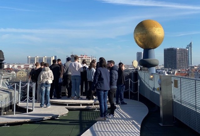 Auch der „Hut“ des Künstlers wurde, nach einigen bewältigten Stufen, auf der Dachterrasse im 10. Stock begutachtet und der Ausblick über Wien genossen.
